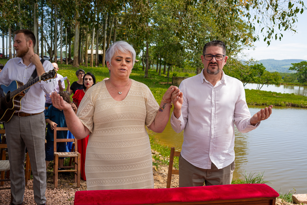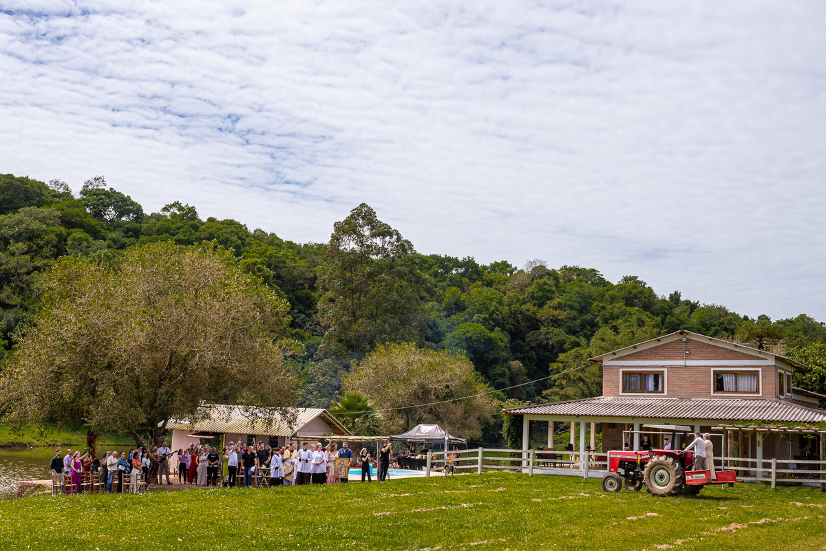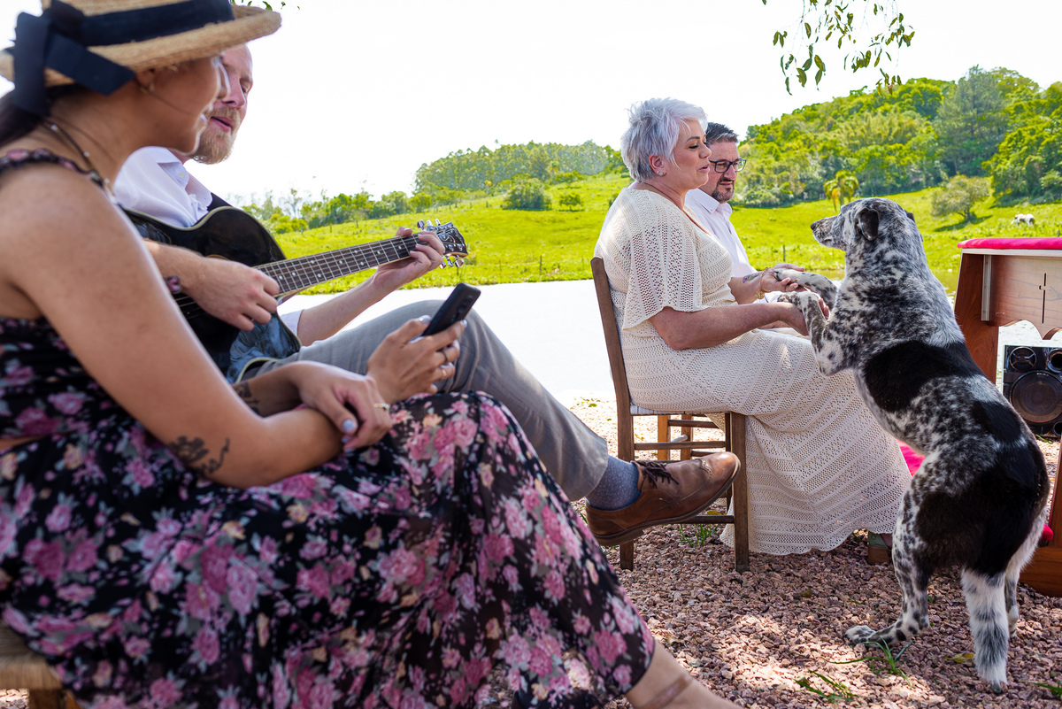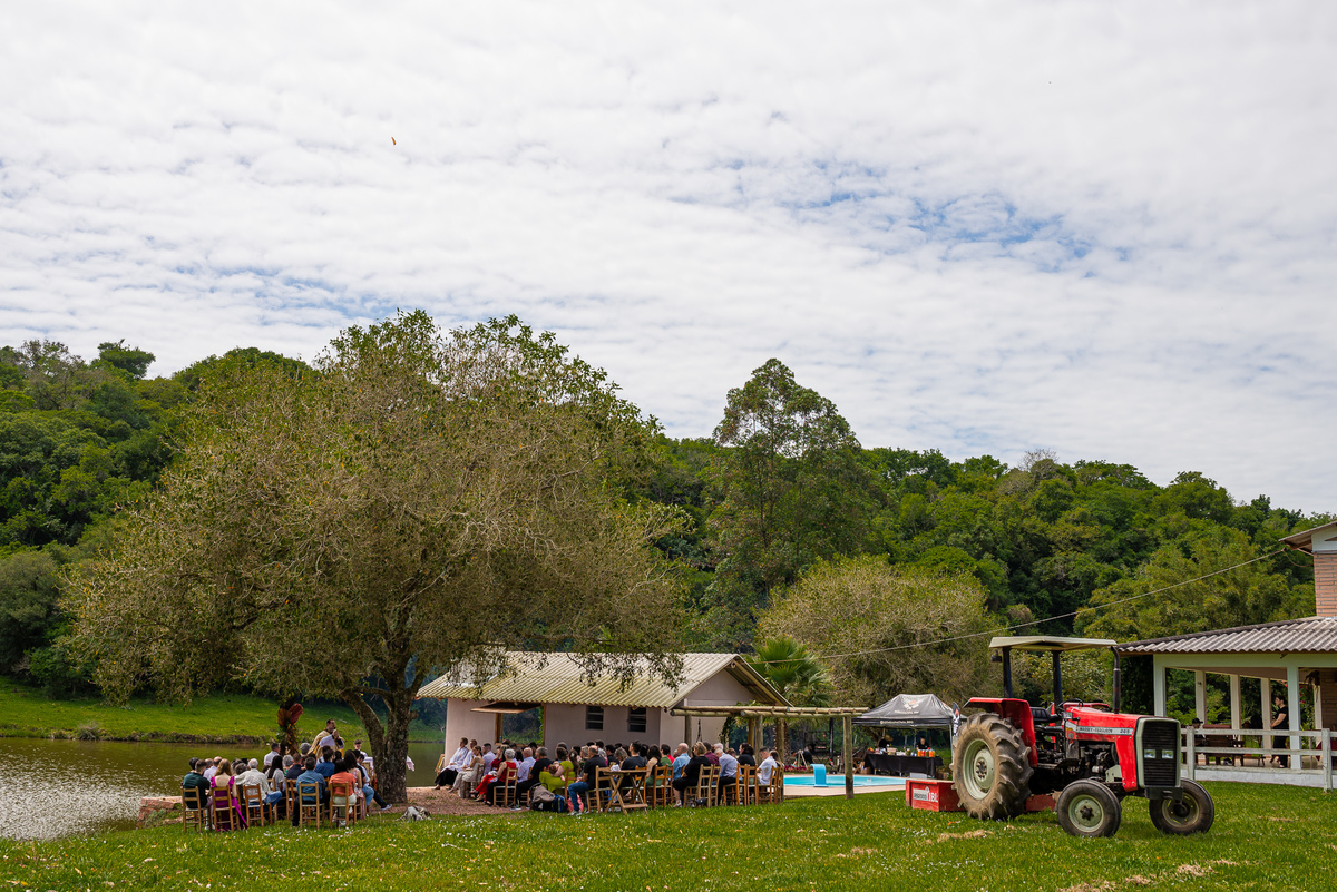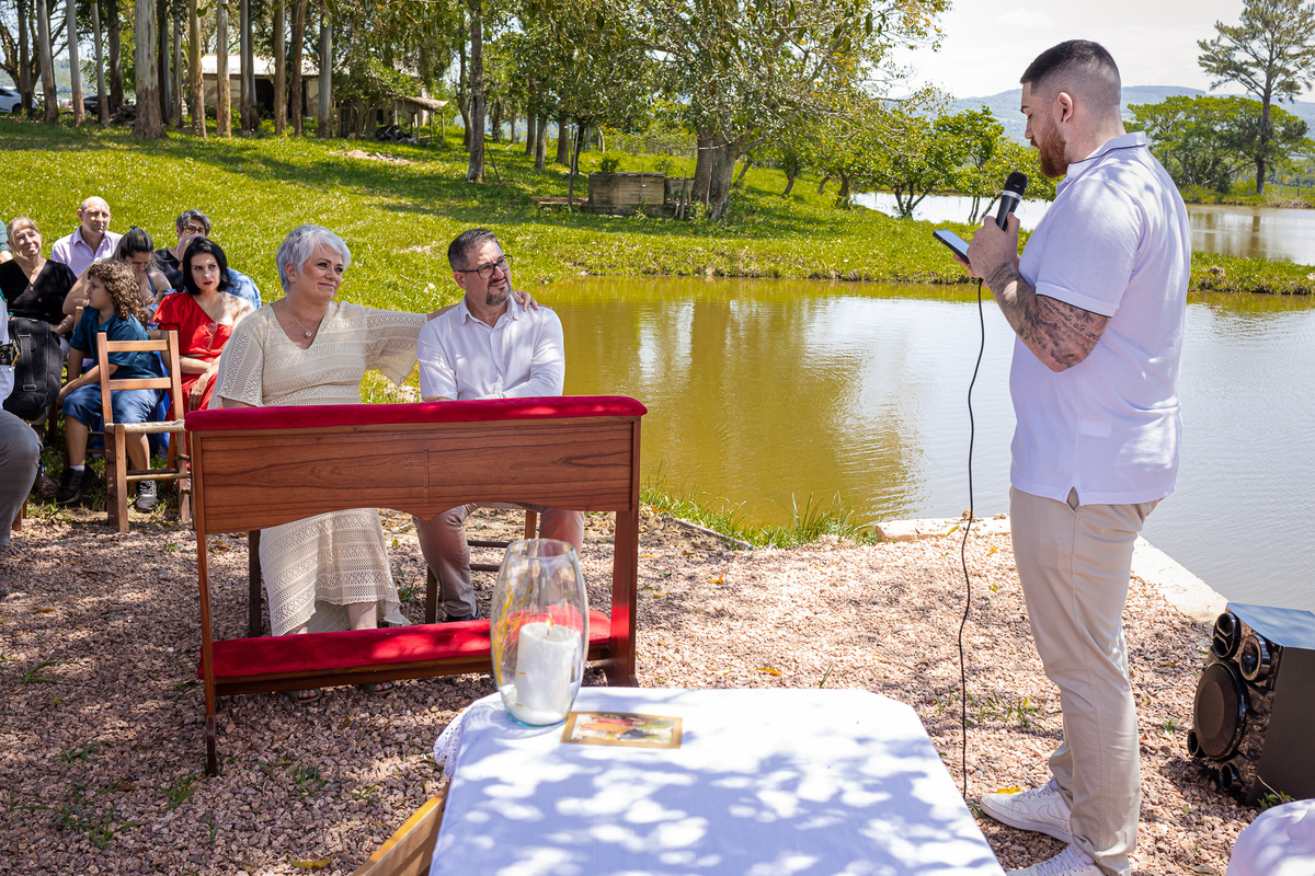 A cerimônia e almoço foi em um Domingo ensolarado, no sítio deles, do jeito que eles amam. Com muitos amigos em volta e um bom churrasco.