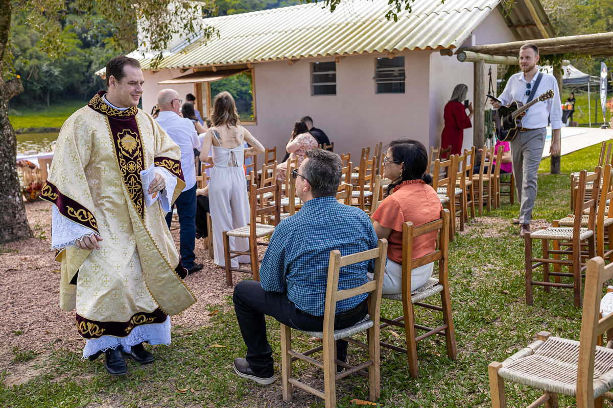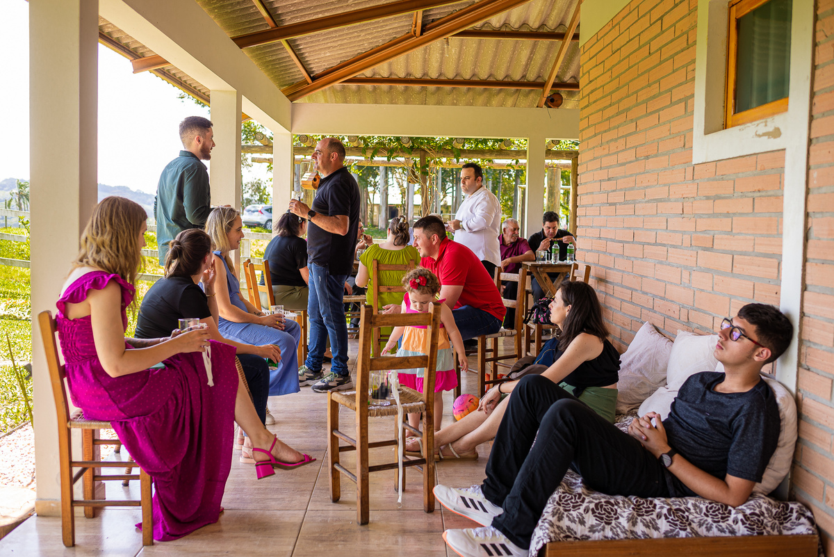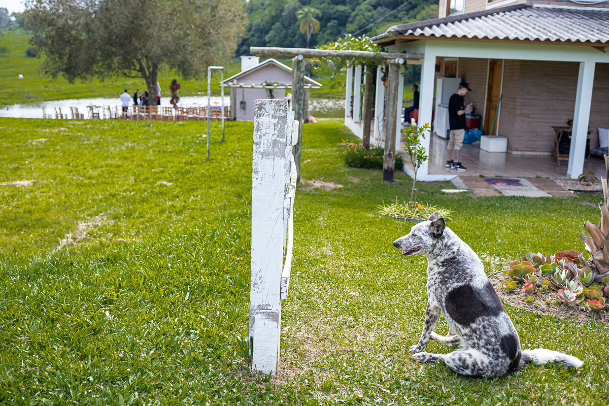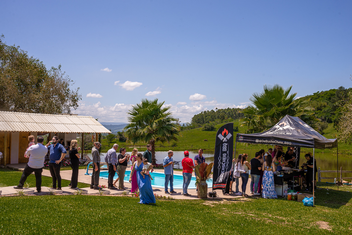 A cerimônia e almoço foi em um Domingo ensolarado, no sítio deles, do jeito que eles amam. Com muitos amigos em volta e um bom churrasco.