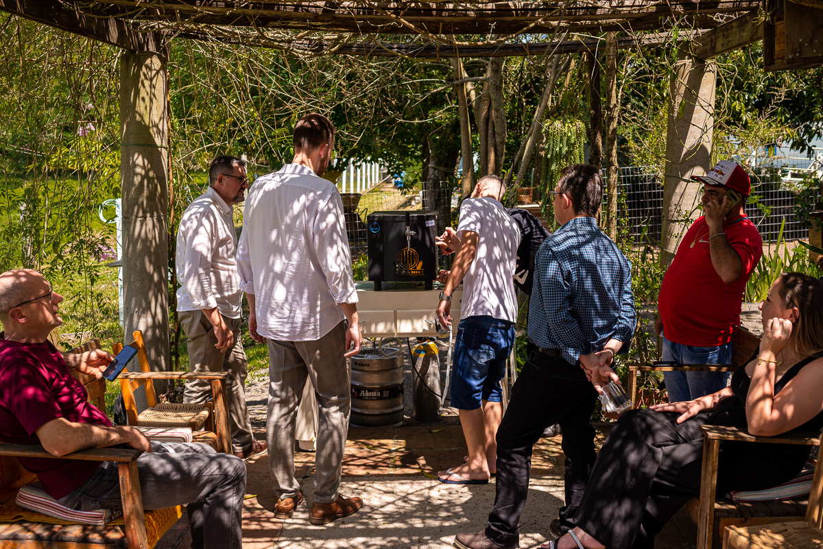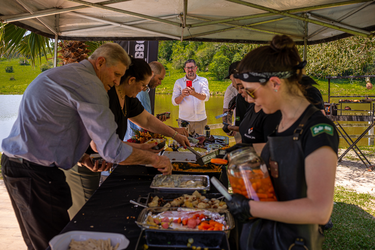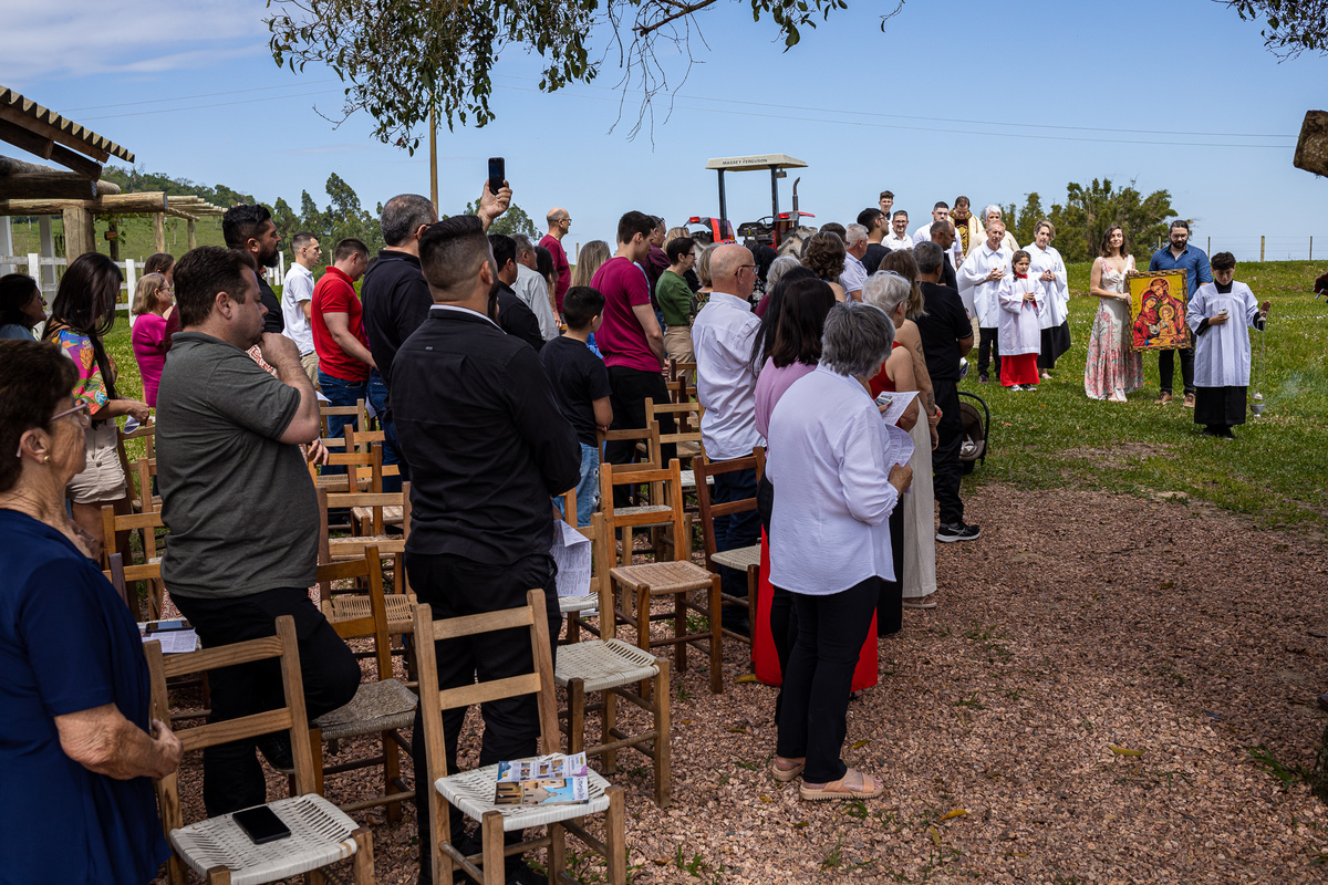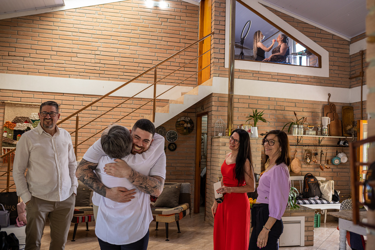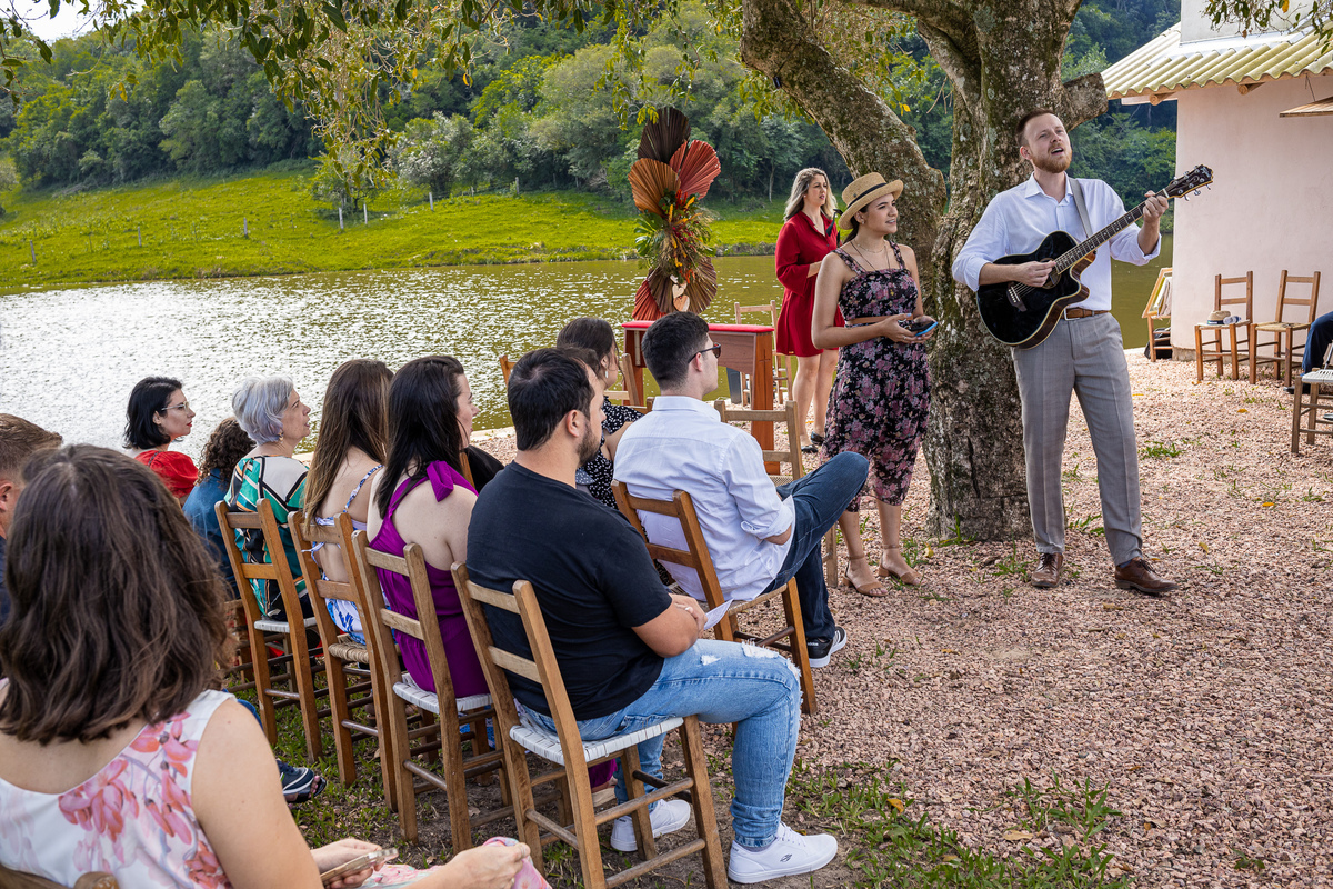 A cerimônia e almoço foi em um Domingo ensolarado, no sítio deles, do jeito que eles amam. Com muitos amigos em volta e um bom churrasco.